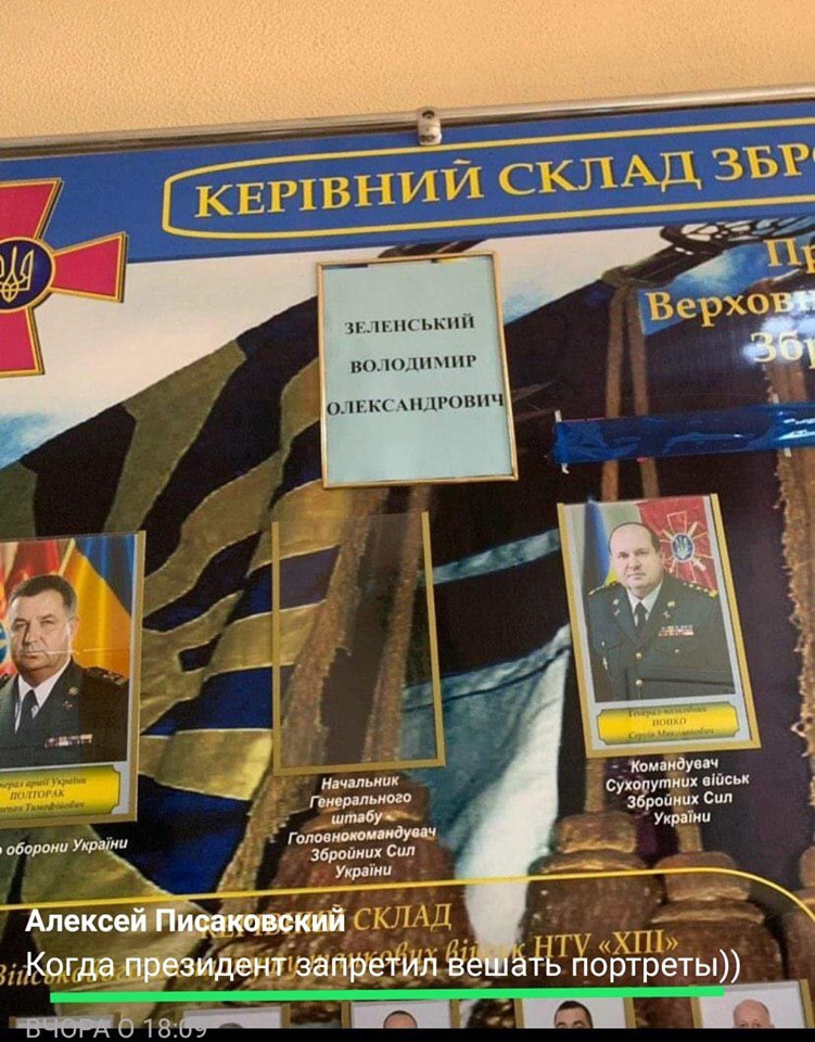 В сети появилось фото, на котором вместо портрета Зеленского висит лист бумаги с фамилией, именем и отчества нового президента Украины. Размещен такой лист в одном из университетов Харькова на стенде, посвященном руководству ВСУ.