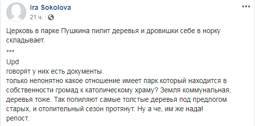 25 января запорожанка Ира Соколова опубликовала пост в Фейсбук, в котором сообщила, что в парке Пушкина проходит массовая вырубка деревьев, а дрова свозятся в находящийся по соседству храм Римско-католической церкви.