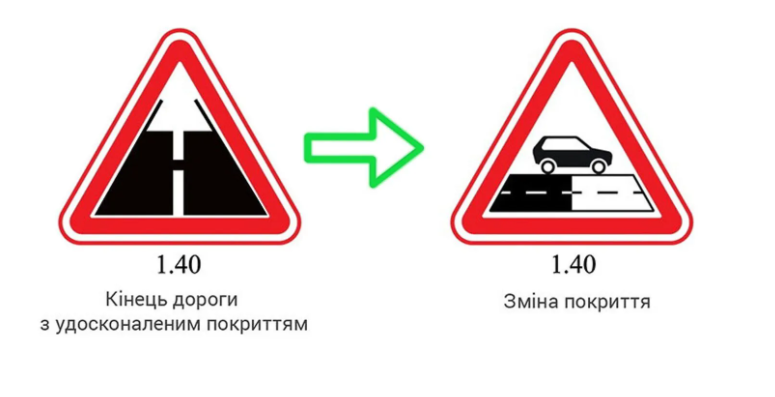 Также изменится один из дорожных знаков – 1.40 «Конец дороги с усовершенствованным покрытием». В новом варианте дорога будет изображена горизонтально, над ней появится силуэт автомобиля. Название знака изменится на «Смена покрытия». и.