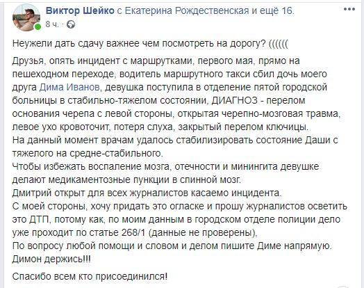 Тем временем стало известно о состоянии здоровья пострадавшей девушки. Как сообщил в Фейсбук Виктор Шейко, у девушки перелом основания черепа, потеря слуха, закрытый перелом ключицы, а состояние остается средне-тяжелым.