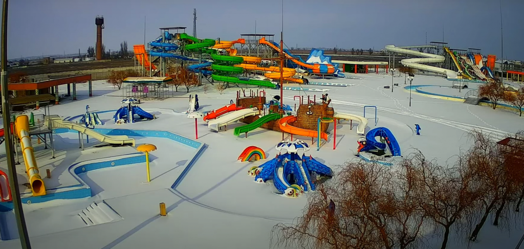 Как видно, в субботу были окутаны снегом не только пляжи и прибрежные участки Кирилловки, но и ее главные достопримечательности — луна-парк «Адреналин-Шоу» и аквапарк «Остров Сокровищ».