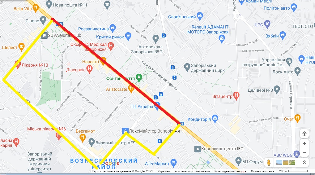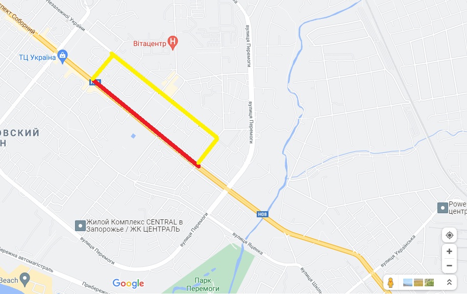 Объезд будет осуществляться через ул. Богдана Хмельницкого, пр. Металлургов, пр. Соборный и дальше по маршруту и в обратном направлении через пр. Металлургов, ул. Рекордную, ул. Портовую и дальше по маршруту.