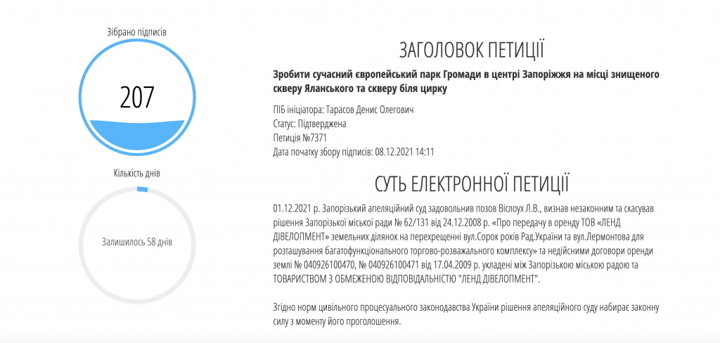 Известно, что 1 декабря, по решению Запорожского апелляционного суда парк все-таки вернули громаде.