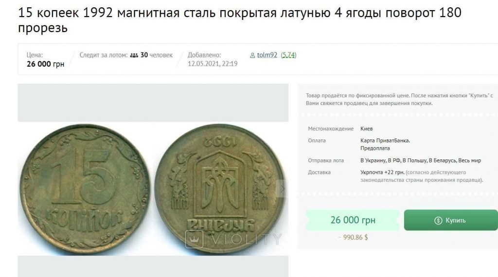 В Украине ценную 15-копеечную монету продают за 26 тысяч гривен.