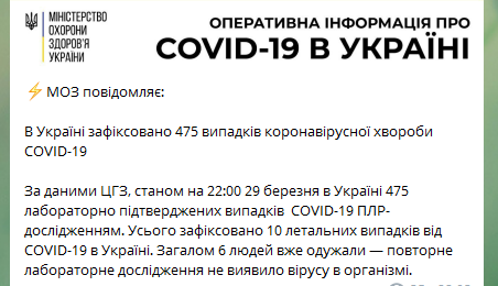 Как сообщает МОЗ Украины, по состоянию на 22:00 29 марта, в стране зарегистрировано 475 случаев заболевания, 10 из которых стали смертельными. По сравнению с аналогичным периодом времени суток 28 марта, количество случаев заражения увеличилось на 119 (на 22:00 28 марта было 356 — прим. авт.).