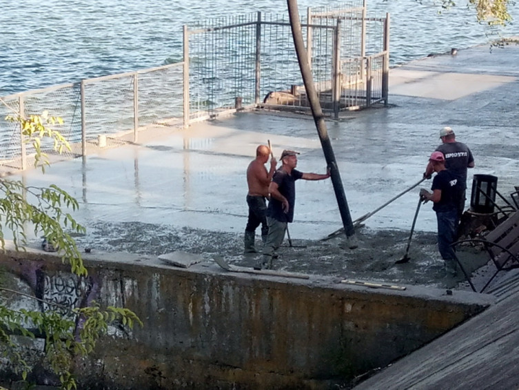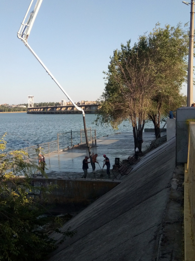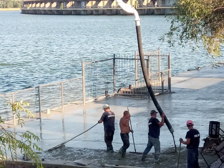 Рабочие бетонируют причал, который уже с 28 августа должны начать использовать для катеров, которые будут перевозить запорожцев с правого берега на левый и обратно.