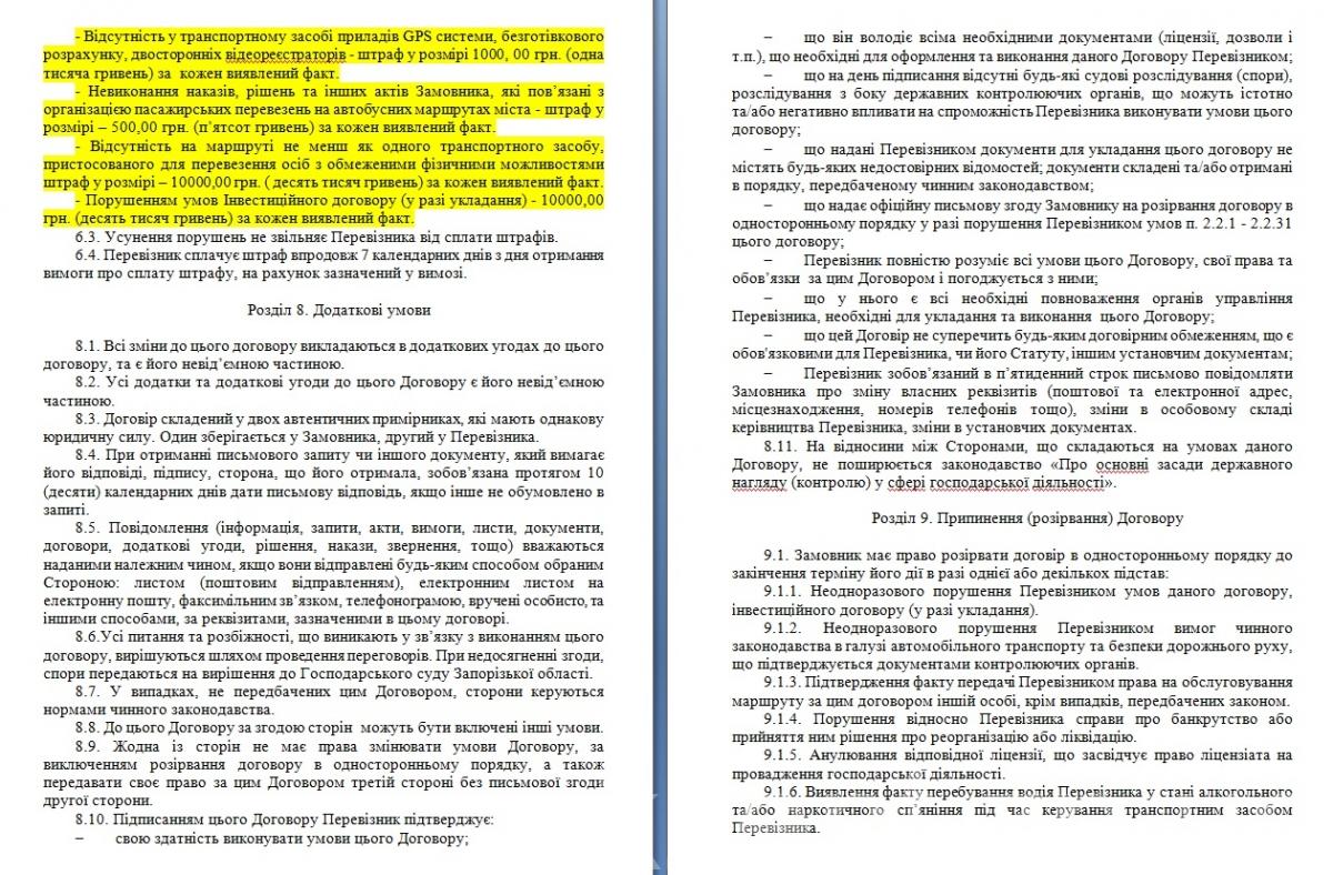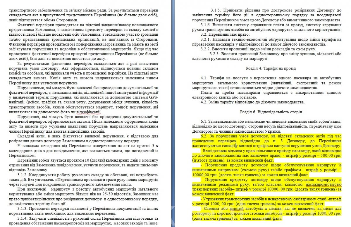 - Порушення предмету договору щодо обслуговування маршруту із визначеними напрямком (схемою руху) та/або графіком — штраф у розмірі – 10000,00 грн. (десять тисяч гривень) за кожен виявлений факт.