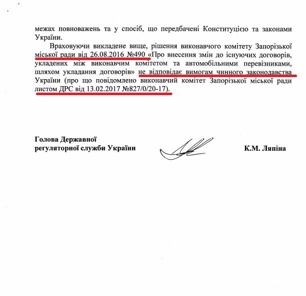 Но и это еще не все. Самое интересное — дальше. Согласно разъяснения государственной регуляторной службы (от 16.022017, заседание исполкома было 24.02.17 — прим. ред.), данные решения не отвечают нормам законодательства, что фактически говорит о том, что запорожские городские власти в открытую игнорируют нормы законодательства и ставят перевозчиков в неравные условия, а проще говоря, берут их «на крючок». При этом госрегулятор поставил в известность о своем решении запорожскую мэрию. Но там, очевидно, его просто проигнорировали.
