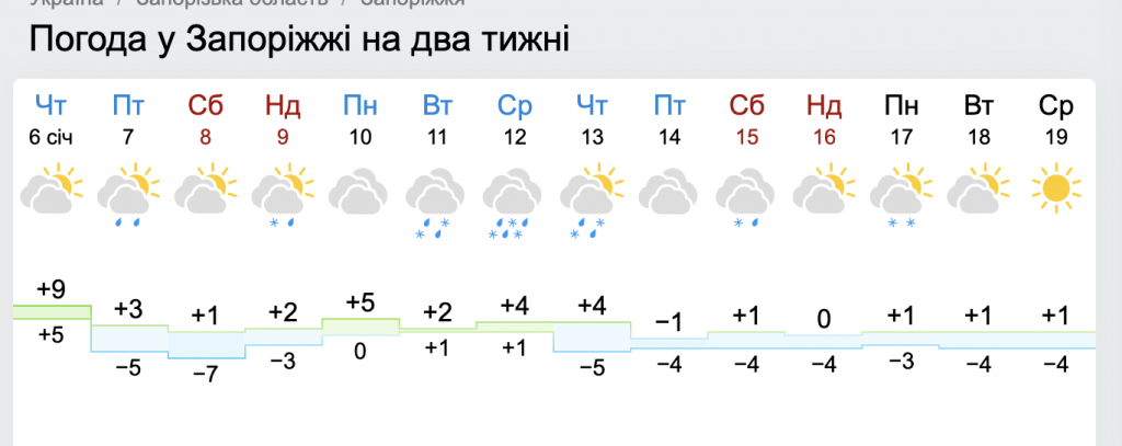На территории Запорожской области ожидается снижение температур на несколько дней — 7-8 января. Затем будут снова плюсовые показатели температур.
