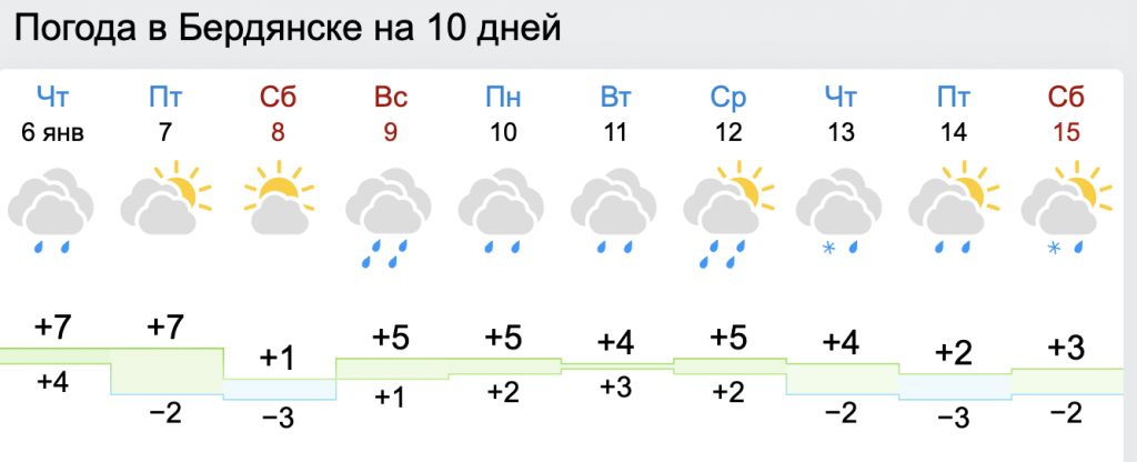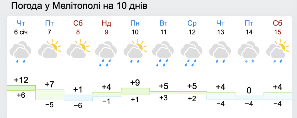 В Мелитополе 7 января ночью температура опустится до -5, днем прогреется до +7. Осадки ожидаются с воскресенья, 9 января. Следующая неделя будет с обильными осадками.
