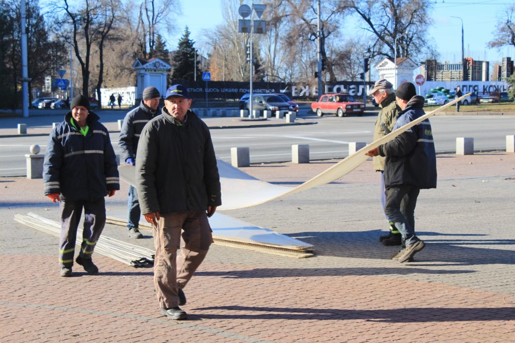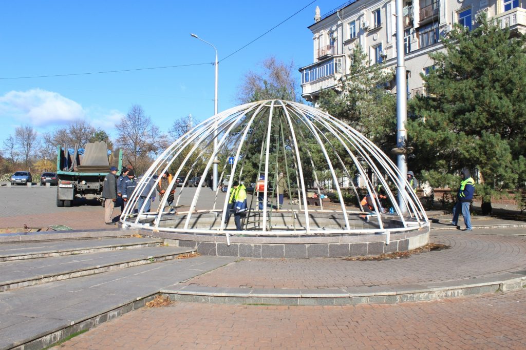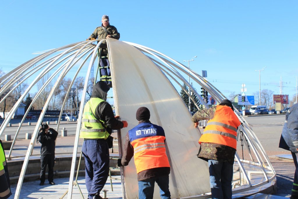 Так, сегодня, 10 ноября, титановцы смонтировали их над фонтанами на площади Поляка, а именно закрепили на металлическом каркасе полупрозрачные листы поликарбоната. Такие работы осталось провести еще на двоих фонтанах.