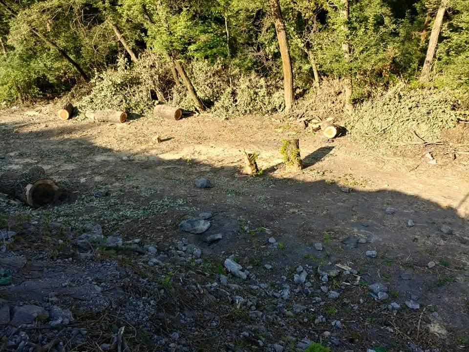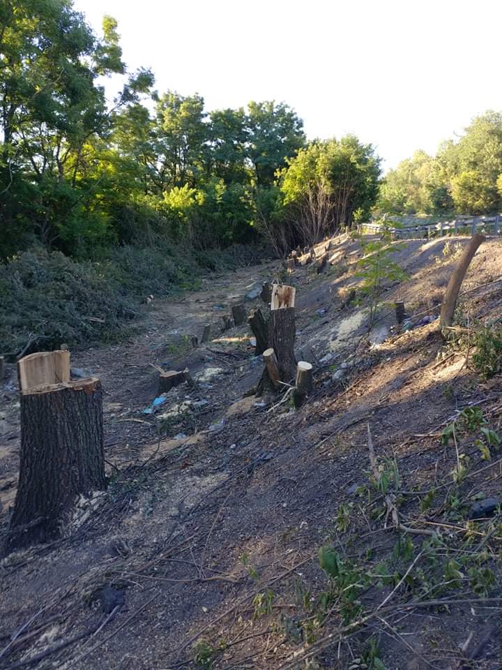 В яме на первом спуске от развилки на Космосе массово вырубили здоровые деревья.