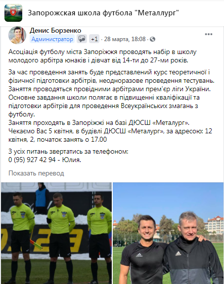 Об этом сообщается на facebook-странице Запорожской школы футбола «Металлург».