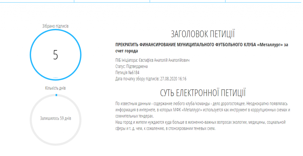 Автор петиции Анатолий Евстафиев предлагает прекратить финансирование муниципального футбольного клуба «Металлург» за счет города. В обосновании приводит то, что содержание клуба — дорогостоящая вещь, и есть более важные вопросы для жителей Запорожья, на которые следует тратить средства.