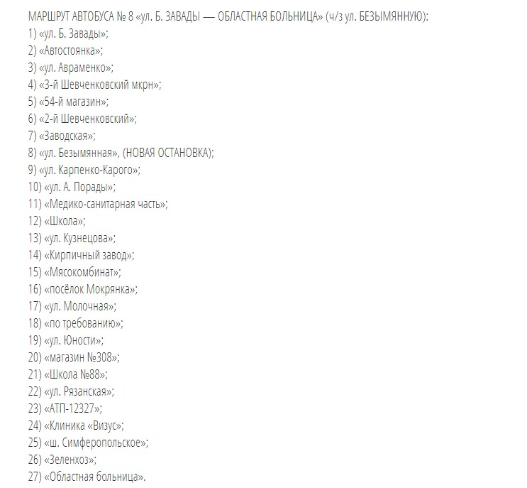 Автор петиции предлагает запустить новый маршрут №8 «ул. Б. Завады — Областная больница» (через улицу Безымянную) и добавить остановку «ул. Безымянная».