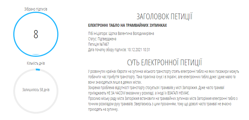 «Просим городской совет города Запорожья установить на трамвайных остановках Запорожья электронные табло с точным расписанием движения трамваев. Обращаемся с этой просьбой, потому что довольно часто трамваи не вовремя приходят на остановку» — пишет автор.