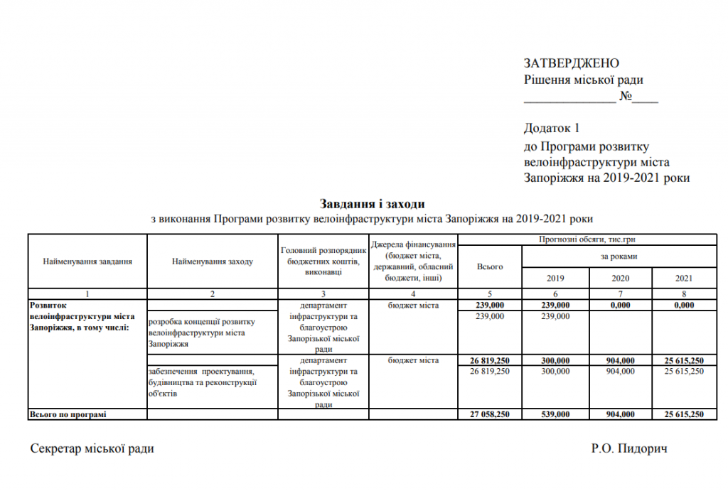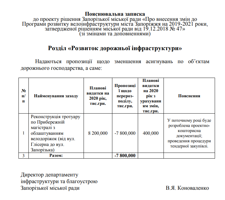 Согласно опубликованного документа, предполагается уменьшить финансирование развития дорожной инфраструктуры в части обустройства велодорожек на 7,8 млн грн. Таким образом, обещанных велодорожек на Набережной от кольца «Дубовки» до ул. Запорожской в 2020 году не будет.