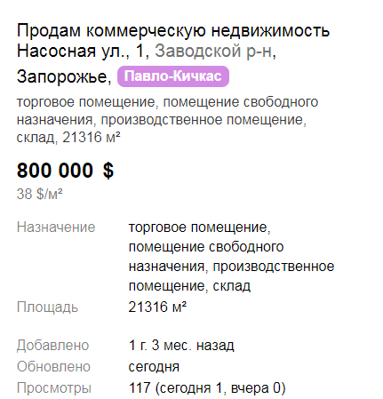 Продается целостный имущественный комплекс, расположенный на земельном участке площадью 23.0856 га по адресу: г. Запорожье, ул. Насосная 1 (Заводский район, Павло-Кичкас). Земельный участок в частной собственности. Кадастровый номер земельного участка – 2310100000:02:017:0017. Целевое назначение: для размещения тепличного хозяйства.