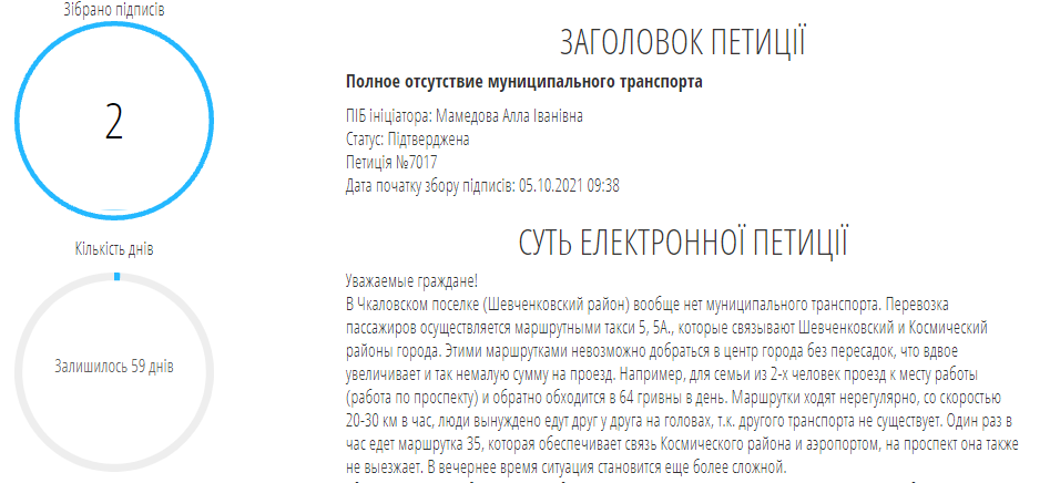 Автор инициативы просит организовать новый муниципальный маршрут, соединяющий Чкаловский поселок и центр города. На данный момент жители поселка пользуются только маршрутками №5 и №5а, которые едут в Коммунарский район.
