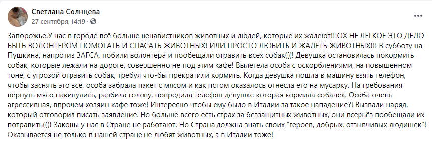 «На требования вернуть мясо накинулись, разбила голову, повредила телефон девушке, которая кормила собачек. Особа очень агрессивная, впрочем хозяин кафе тоже!» — говорится в сообщении.
