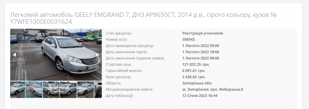 На легковой автомобиль Geely Emgrand 7, 2014 года выпуска, был наложен арест Коммунарским отдел государственной исполнительной службы в Запорожье Южно-Восточного межрегионального управления Министерства юстиции (г. Днепр), как на имущество должника.