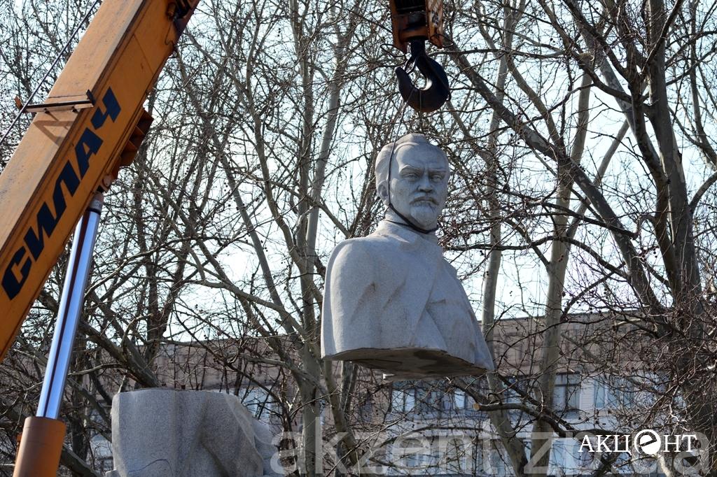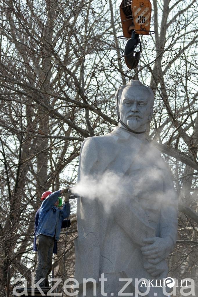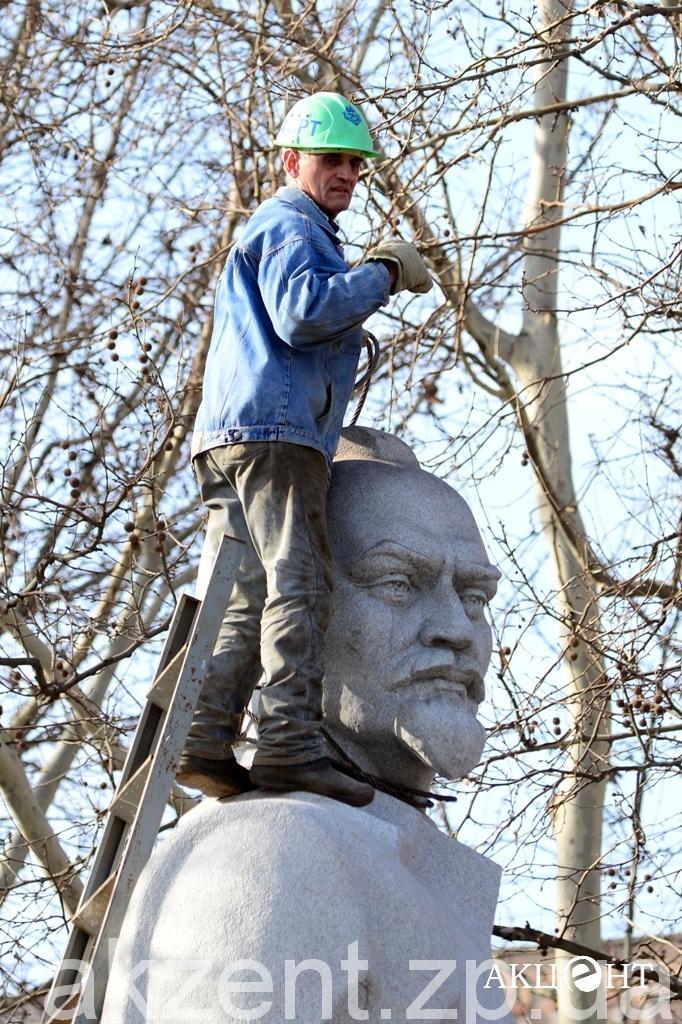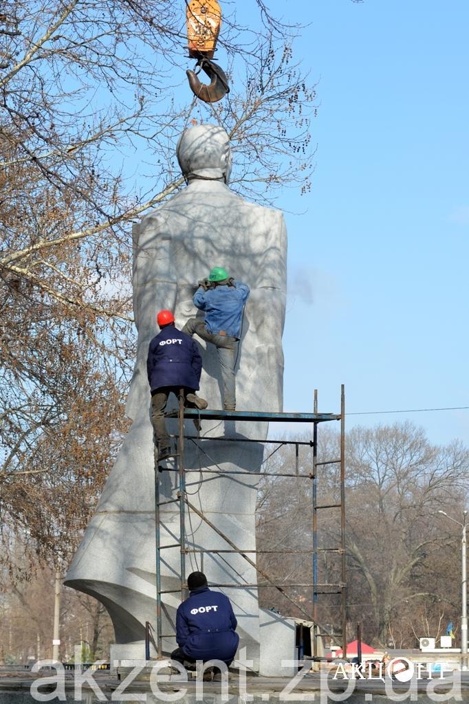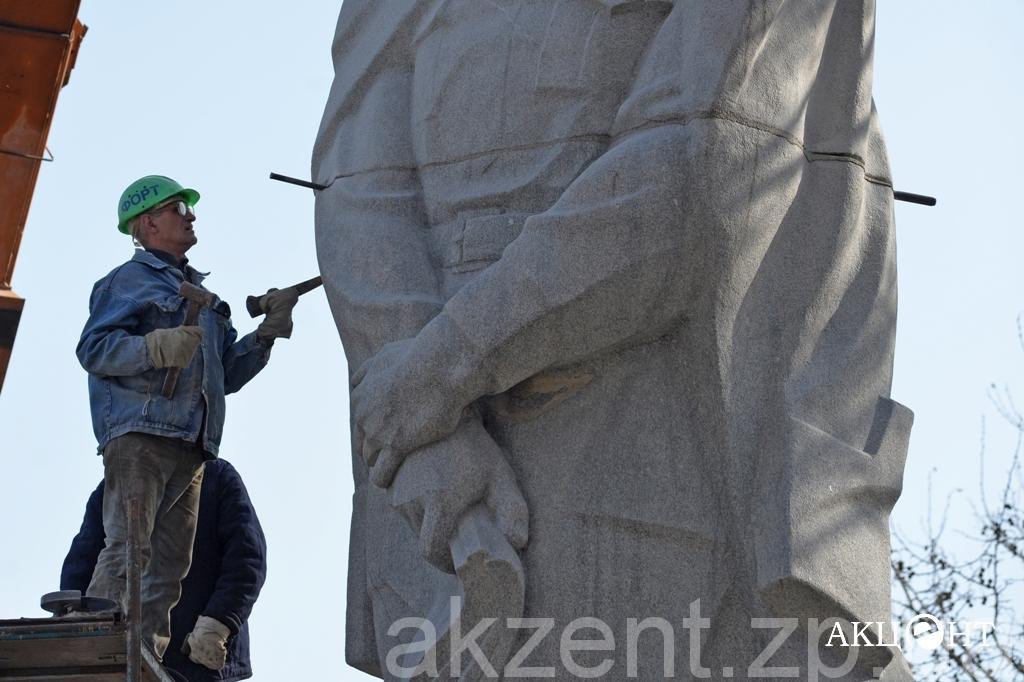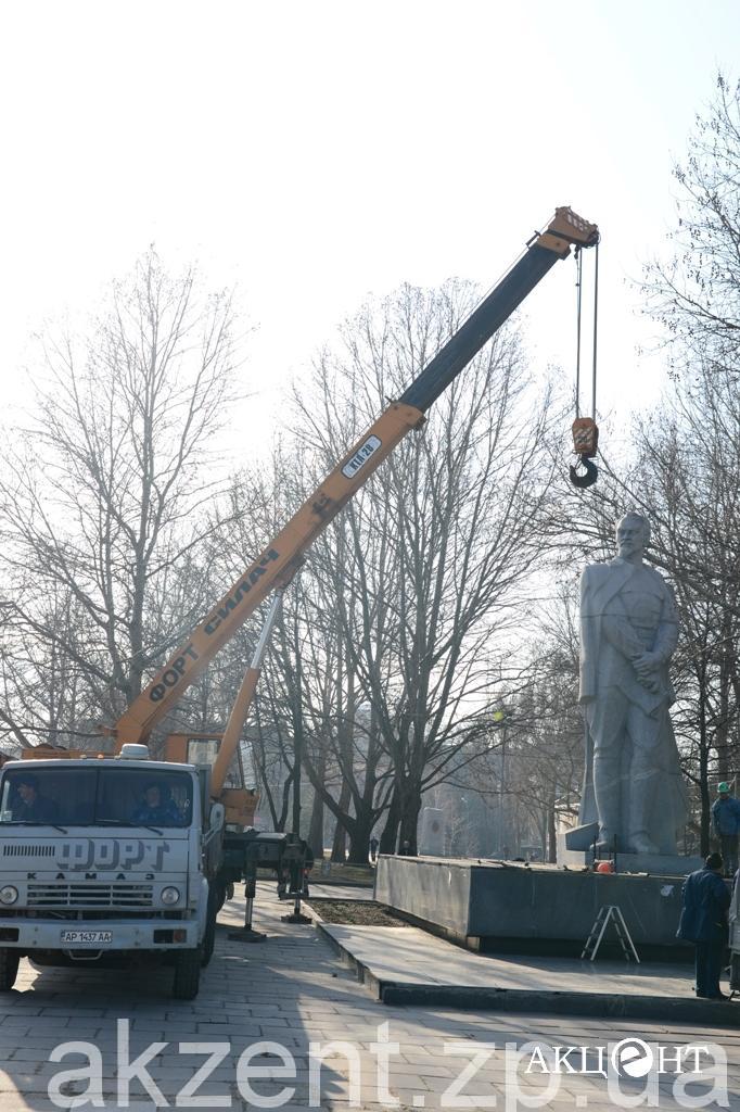 Демонтажем занимаются рабочие фирмы «Форт». Напомним, демонтаж памятников Ленину, Дзержинскому и Орджоникидзе обойдется в 311, 2 тысяч гривен. Самым дорогим оказался Ленин — на его снос потратят 199 тысяч гривен.