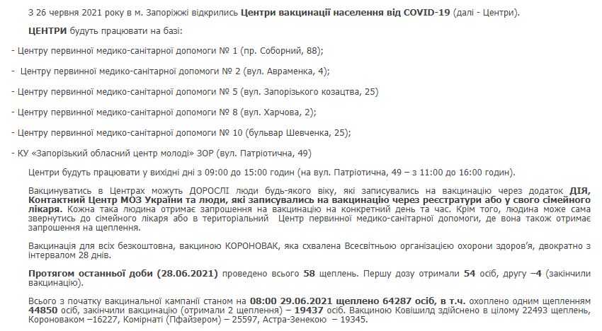 Ранее зам главы Запорожской ОГА Злата Некрасова на своей странице в Фейсбук сообщала, что 6 центров массовой вакцинации будут работать в выходные и праздничные дни, то есть в понедельник центр на Патриотической и центры в поликлиниках должны были быть открытыми. В телеграм-канале главы ЗОГА Александра Старуха в свою очередь была размещена информация о работе в выходные и праздничные дни Центра массовой вакцинации по ул. Патриотической, 49. Условиями для проведения вакцинации согласно публикации главы ЗОГА являются регистрация и заявка в приложении «Дія», а также наличие паспорта, ИНН и номера мобильного телефона. Декларация с семейным врачем необязательна.