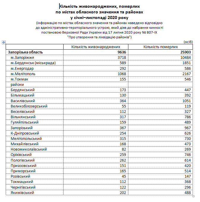 Как видно из цифр, в г. Запорожье за январь-ноябрь 2020 года родилось 3718 человек, а умерло 10484. То есть смертность превысила рождаемость почти в 3 раза. Похожие пропорции в Бердянске — там на 589 родившихся приходится 1851 умерший человек.