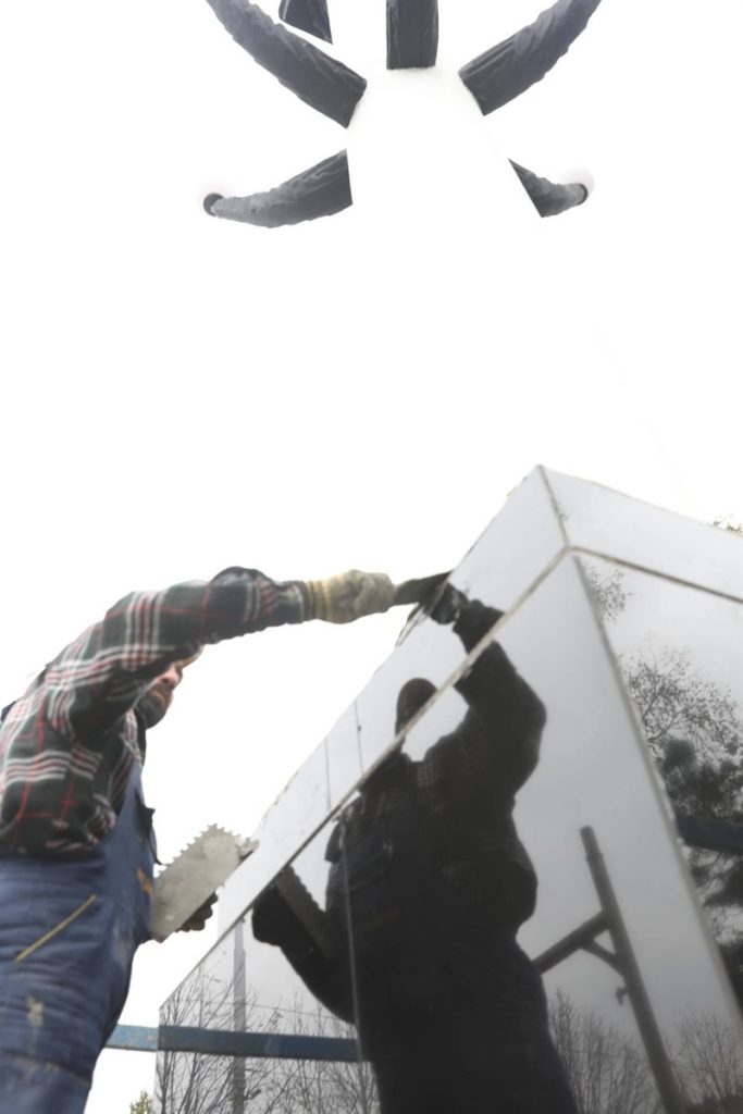 В парке Трудовой Славы продолжается реконструкция входной группы с колоннами. Теперь они стали выше еще на 1,5 метра от прежнего размера.