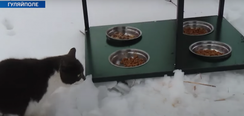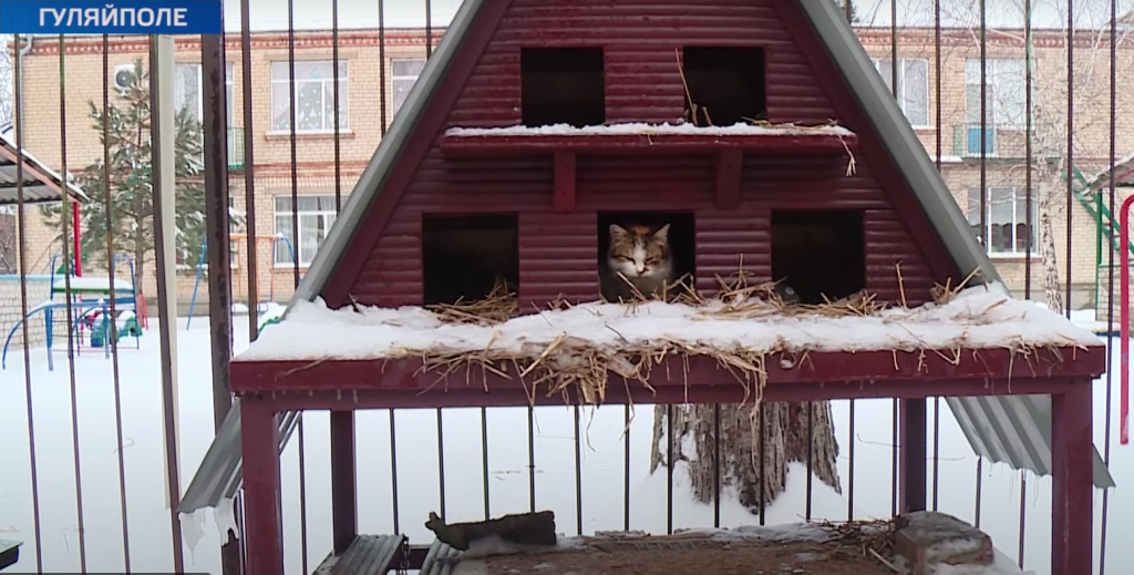 «В таком деревянном домике с соломой в середине коты могут спастись от мороза или жары, либо поселиться тут на постоянной основе и не искать себе пищу на помойках», — отмечают в сюжете.