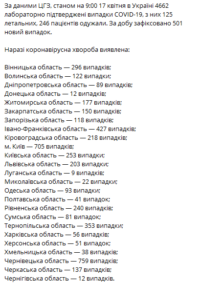 Согласно опубликованной информации на 9:30 17 апреля в Украине зарегистрировано 4662 случай COVID-19, из которых 125 смертельных, 246 пациентов выздоровело.