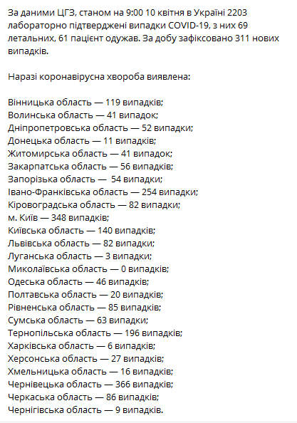 Согласно информации на 9:30 10 апреля в Украине зарегистрировано 2203 случаев COVID-19, из которых 69 смертельных, 61 пациентов выздоровело.