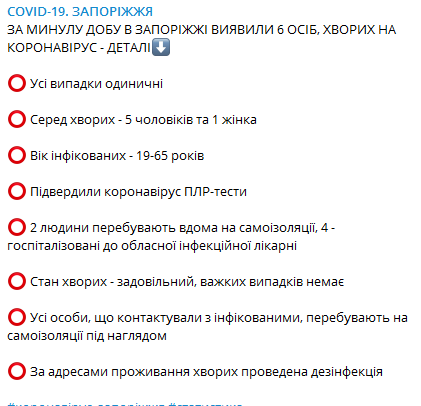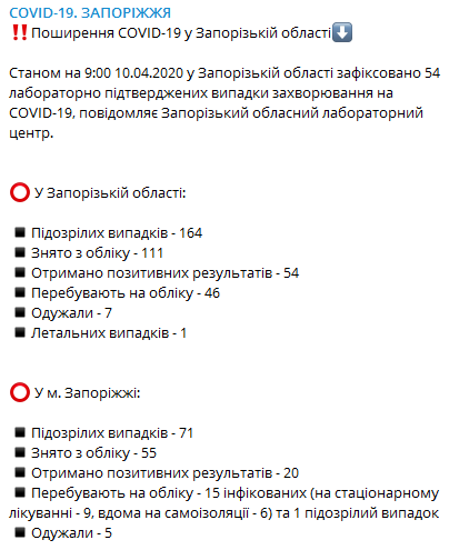 Утренние данные Запорожского областного лабораторного центра совпадают с данными МОЗ. Из 54 случаев, 20 зарегистрировано в Запорожье (рост на 6 случаев) и 34 случая в области (рост на 1 случай.)