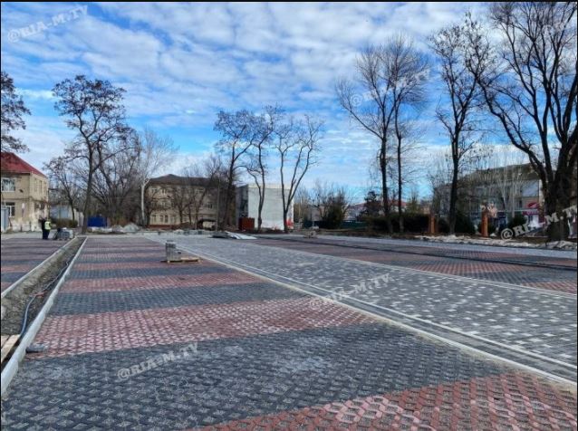 Перед водно-спортивным комплексом укладывают тротуарную плитку. Рядом монтируют автостоянку. Частично площадь вымощена эко-плиткой.