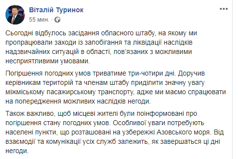 Как сообщил у себя на странице в Фейсбук Туринок на заседании были отработаны первоочередные мероприятия по предотвращению и ликвидации чрезвычайных ситуаций, которые могут возникнуть из-за резкого ухудшения погодных условий. В совещании, прошедшем в ГУНП Заопрожской области приняли участие также первый заместитель главы ОГА Иван Федоров, заместители председателя Андрей Антонов и Владимир Тарасенко, начальник ГУ ЧП в Запорожской области Николай Лушпиенко, начальник ГУ ГСЧС Украины в Запорожской области Алексей Лепский, начальник Управления патрульной полиции в Запорожской области Светлана Михайловская, представители коммунальных предприятий.