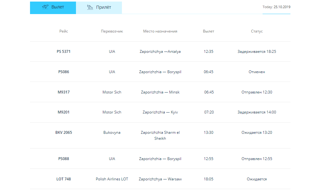 Отметим, запорожский аэропорт открылся после ремонтных работ 22 октября. Но буквально на следующий день работы в связи с погодными условиями было отменено несколько рейсов в Киев, Польшу и Турцию. Сегодня, 25 октября, отменен утренний авиарейс в Борисполь и двое задерживаются — на Киев и Анталию. Это сообщается на сайте аэропорта. На завтра, 26 октября, также запланированы рейсы на Киев и Турцию.