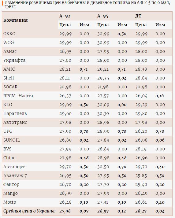 Средняя цена по стране бензина А-92 6 мая составила 27,98 грн/л, А-95 подорожал до 28,97 грн/л, ДТ — до 28,27 грн/л. Таким образом, средний рост цен за сутки составил по Украине 4–12 коп./л (см. табл.).