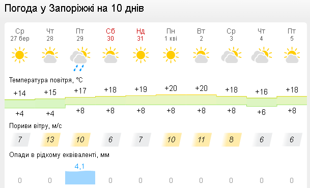 Так, якщо сьогодні, 27 березня, у Запоріжжі очікується сонячна погода і +14 градусів Цельсія. Поступово температура повітря зростатиме у наступні дні: до 1-2 квітня очікується тепло на рівні +20-22 градуси Цельсія.