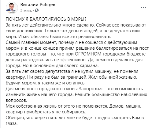 Кандидат на пост Запорожского городского головы Виталий Рябцев обратился к избирателям, где пояснил свою мотивацию в участии в выборах мэра.