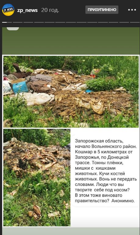 Отходы от животных выбросили на трассе в Вольнянском районе.