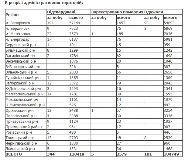 За последние сутки в Запорожской области выявлено 344 новых случая заражения COVID-19, а также 5 летальных исходов.