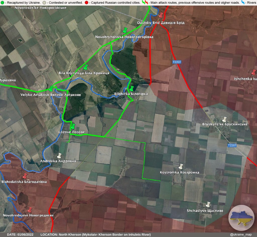 «Учитывая, что дорога Т-2207 уже перерезана украинскими войсками… и они так же продвигаются к Золотой Балке вдоль Днепра и соответственно вдоль дороги Т-0403… в самое ближайшее время, вопрос снабжения (не говоря уже про своевременный отход) того стада, что пытается изображать из себя «угрозу Кривому Рогу», встанет для командования войск противника со всей остротой», — пишет Машовец.