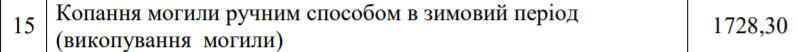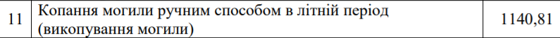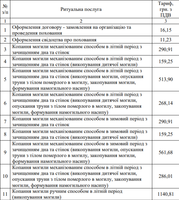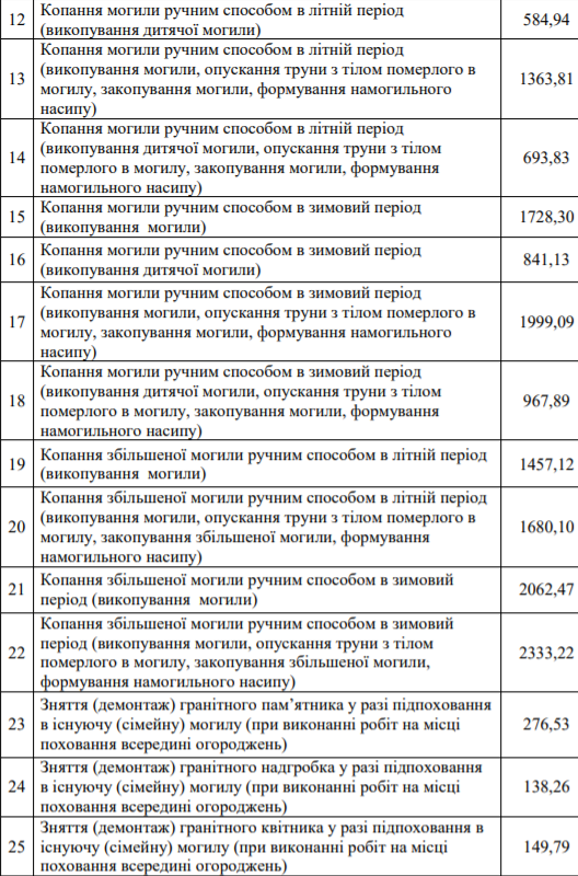 Стоимость копания могилы ручным способом в летний период равняется 1140,81 грн, в зимний — 1728,30 грн (до этого было 1010,49 и 1138,40 грн).