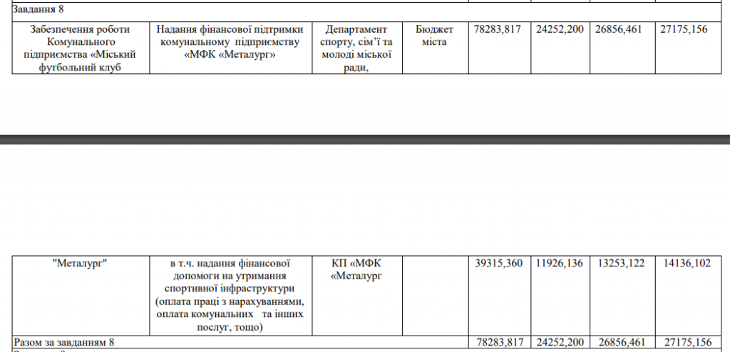 Так, в 2021 году МФК «Металлург» за счет налогоплательщиков Запорожья выделят 27,175 млн грн. Это почти на 300 тысяч гривен больше, нежели в 2020 году. Из этой суммы 14,13 млн грн (почти на 900 тысяч больше нежели в 2020 году) — финансовая помощь на содержание спортивной инфраструктуры (оплата труда, оплата коммунальных услуг и т.д.)