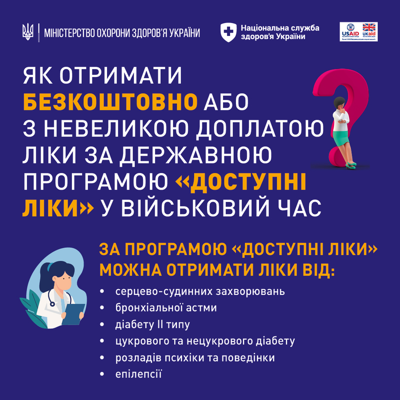 За програмою «Доступні ліки» можна отримати ліки від серцево-судинних захворювань, бронхіальної астми, діабету ІІ типу, цукрового та нецукрового діабету, розладів психіки та поведінки, епілепсії.