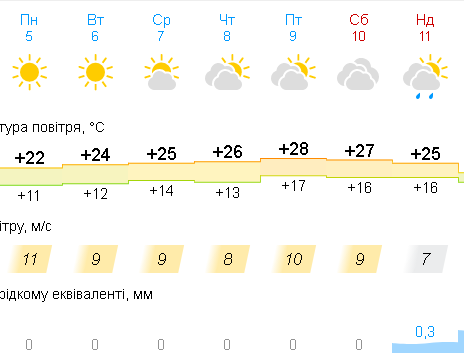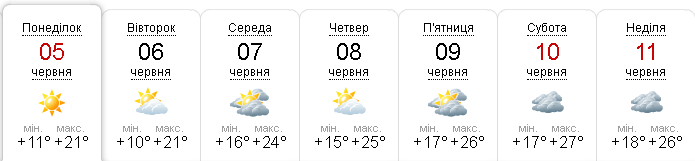 Маскимальна температура повітря зростатиме: якщо на початку тижня вона сягатиме +21 градус Цельсія, то до суботи цей показник поступово збільшиться +27 градусів Цельсія.