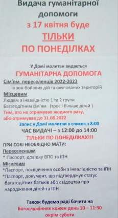 Видача гуманітарної допомоги в Домі молитви (м. Запоріжжя, вул. Світла, 10) з 17 квітня буде здійснюватись лише по понеділках.