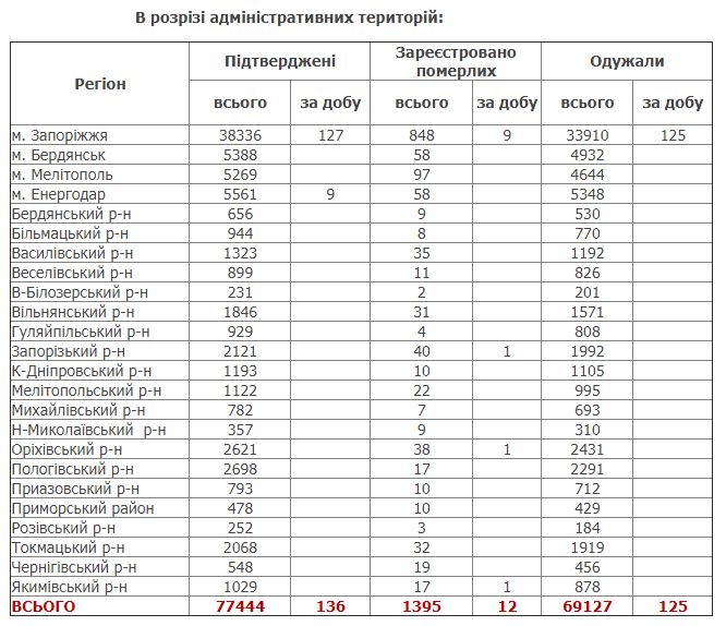 За последние сутки в Запорожской области было выявлено всего 136 новых случаев заболевания COVID-19, также было зафиксировано 12 летальных исходов.