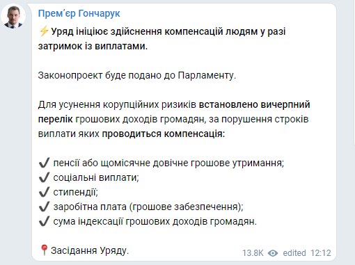 Премьер Гончарук сообщил о намерении выплачивать компенсацию украинцам за задержку зарплат, пенсий, социальных выплат.