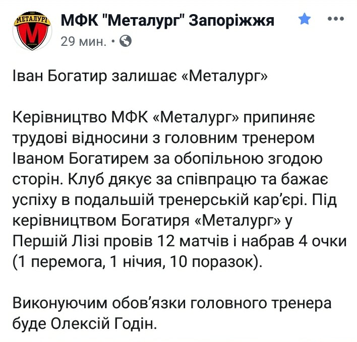 Отметим, «Металлург» под руководством Ивана Богатыря крайне неудачно выступал в Первой лиге. В активе команды после 12 туров всего 4 очка — 1 победа, 1 ничья и 10 поражений. Как следствие — последнее место в турнирной таблице первенства.